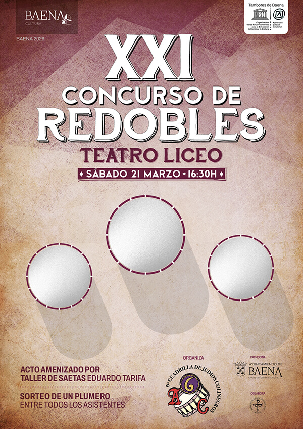 Como cada Sábado de Pasión, el próximo sábado 21 de marzo de 2026 podremos disfrutar del XXI Concurso de Redobles de Baena, organizado la Asociación Cultural Sexta Cuadrilla de Judíos Colinegros, gracias al patrocinio del Ayuntamiento de Baena y la colaboración de la Agrupación de Cofradías de Baena. Como viene siendo habitual, el acto tendrá lugar en el TEATRO LICEO a partir de las 16:30 horas, y será amenizado por el Taller de Saetas «Eduardo Tarifa». La entrada será gratuita y todos los asistentes participarán en el sorteo de un plumero.